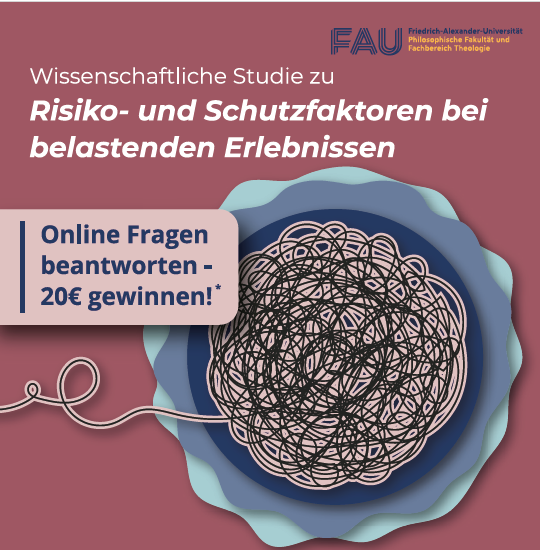 Die garantiert anonyme Befragung (Dauer 20 Min.) wird im Rahmen der Masterarbeit von Franziska Niepel durchgeführt. Als Dankeschön erhalten Sie 0,5 Versuchspersonenstunden oder nehmen optional an einer Verlosung von 10 × 20 Euro teil.